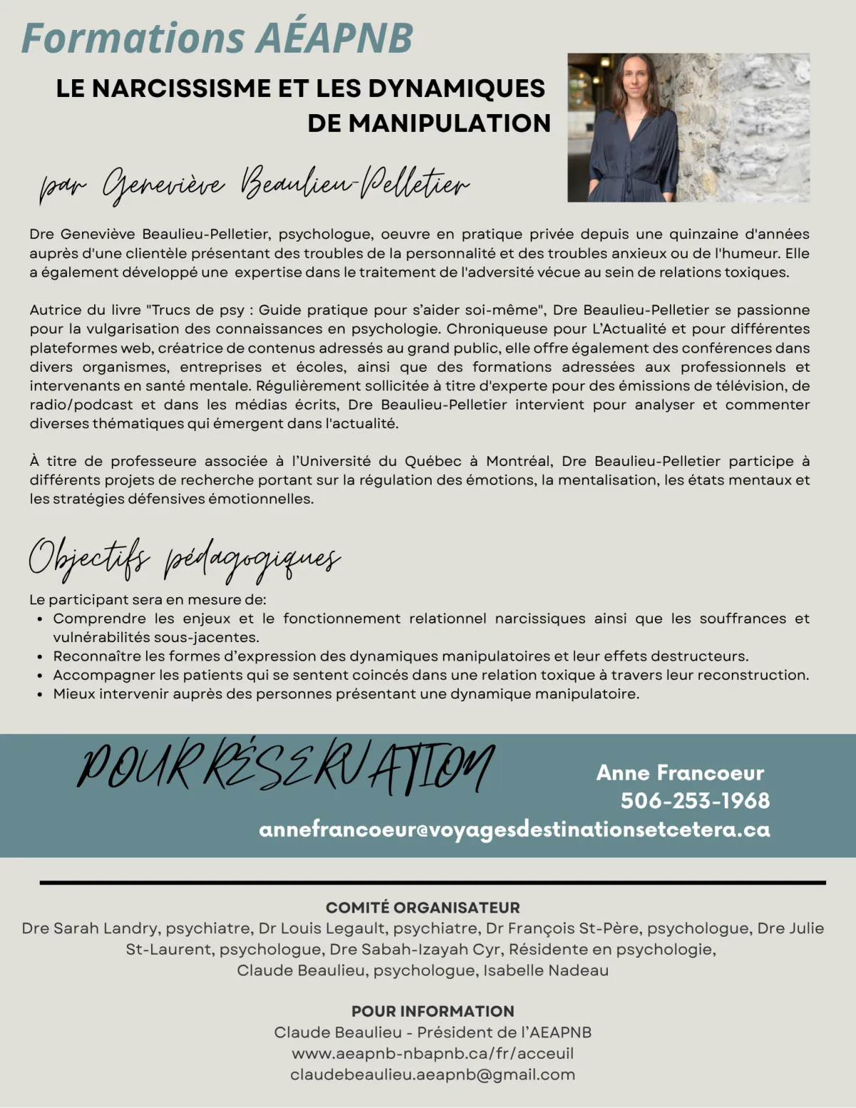 L’A.E.A.P.N.B. propose depuis 2005 des formations pour ceux qui exercent dans les champs médical, psycho-social et éducatif. Toutes les formations organisées par l’ A.E.A.P.N.B. ont été accréditées par le Collège Royal du Canada et par d’autres organismes professionnels. De plus, nous sommes à l'écoute de nos membre c'est pourquoi la plupart des formations sont mises en place suite à des suggestions faites par des participants.